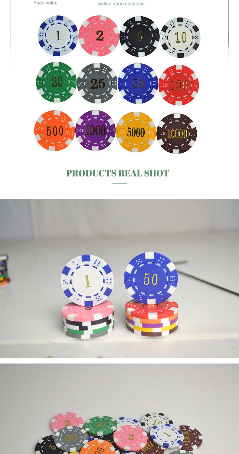The denomination of this Poker Chip is the bronzing process used. The hot stamping process utilizes the principle of thermal transfer. Its basic process is the pressure state, that is, when the anodized aluminum is pressed by the hot stamping plate and the substrate, the aluminum layer and the anodized aluminum base film are peeled off and transferred to the substrate at the same time. superior. After rapid cooling and solidification, the aluminum layer is firmly attached to the substrate, completing a hot stamping process.