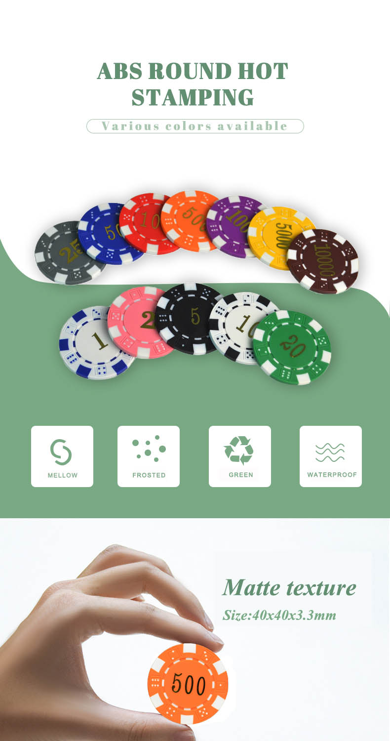 This is a made of ABS material chip, its size is 39*mm, and the weight of each chip is 11.5g. Abs chips have a total of 12 different denominations, and each denomination corresponds to a different color, so that poker players can quickly identify each denomination just by relying on the color.