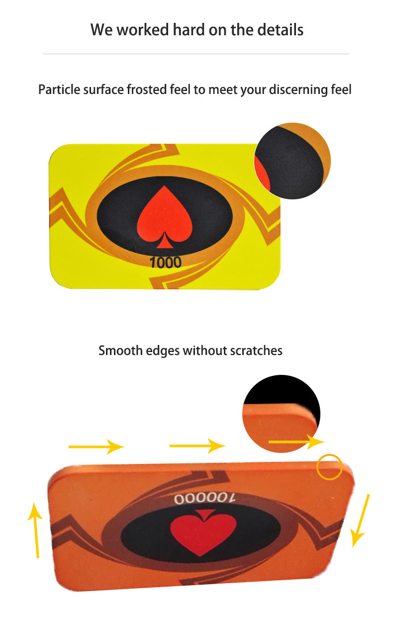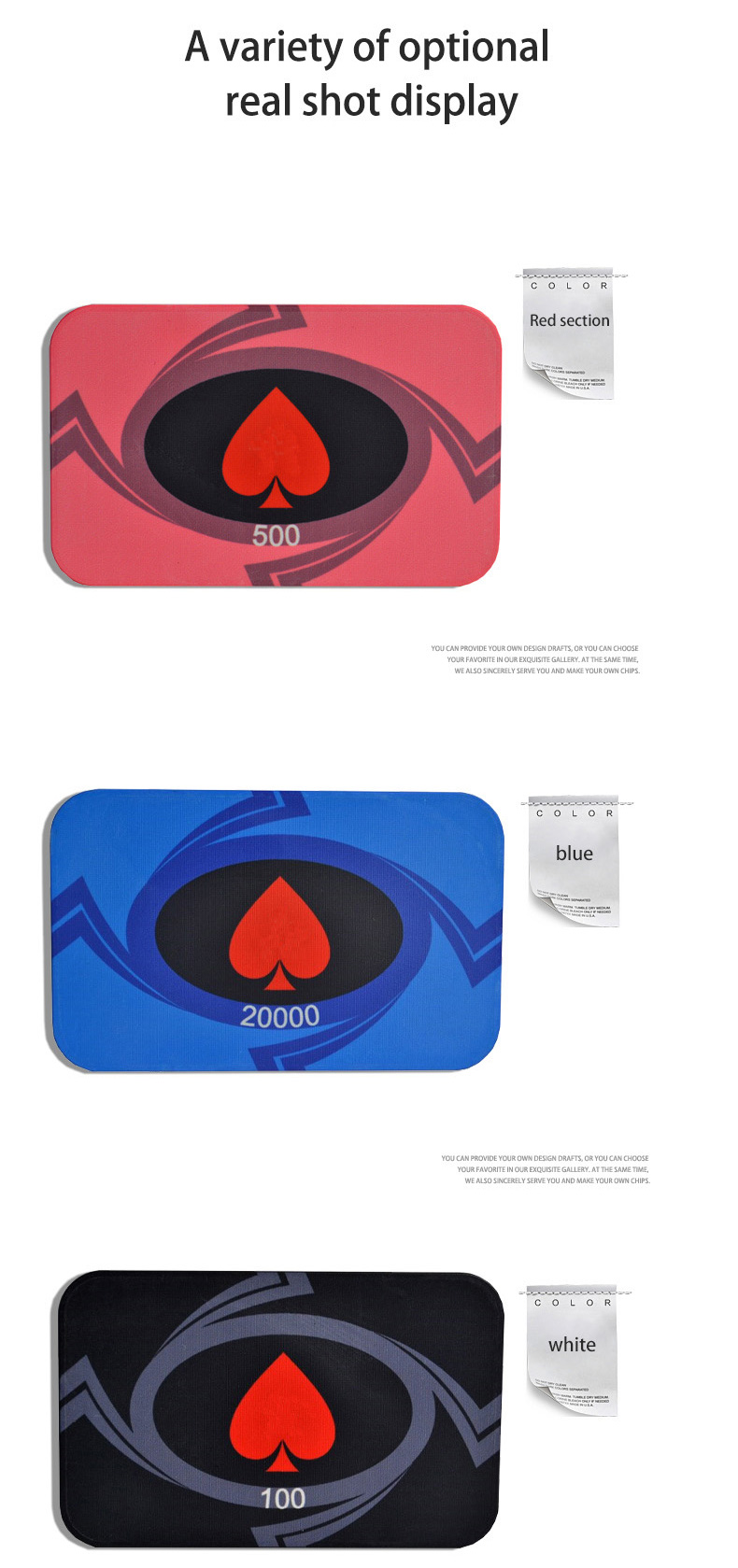 This is a square ceramic chip with a face value and a heart shape in the middle of the chip. Its surface has a slightly matte texture, which can make the chip feel better. It is also waterproof and can be washed directly if it gets dirty.