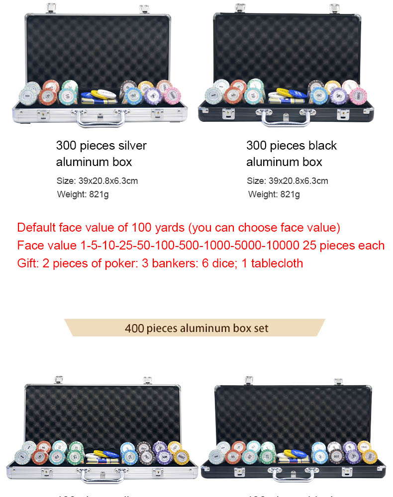 The chips included in the clay chip set are sold separately. Moreover, the face value in the set can be selected at will, please explain to us after placing the order. If you buy it, but do not specify the face value you want, then we will ship it to you according to the face value of our standard set, it The face value of is usually the face value displayed throughout our set.