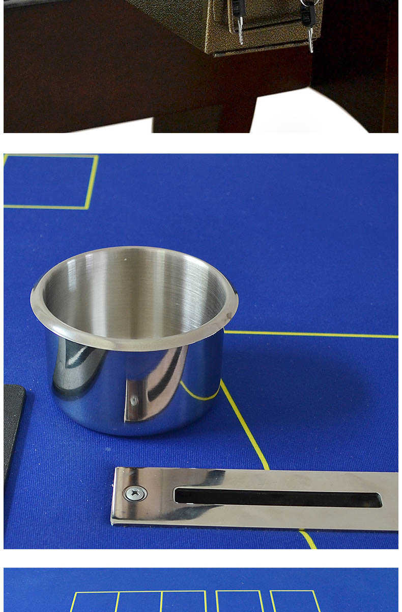 This German gambling poker table has 10 positions and can accommodate 10 players and 1 croupier. The size of the poker table is 260*140*81cm, with a large space and a drink cup holder. The outer ring of the desktop is a leather track, which brings a comfortable touch to the player. Desktop wallpapers can be customized, printed or changed in design.